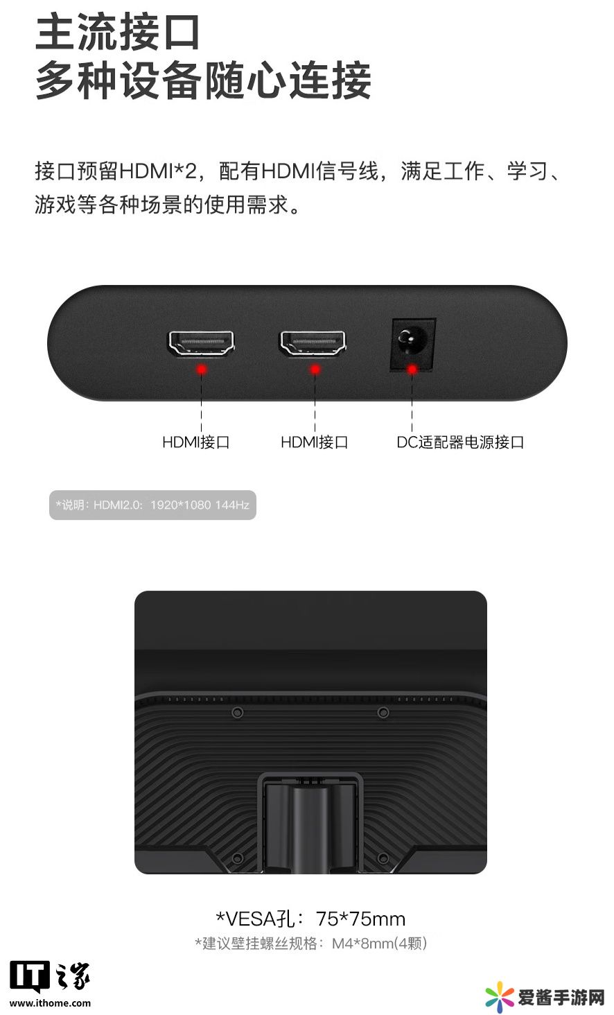 这款显示器支架不支持调节,不过显示器本体支持VESA 75×75mm壁挂,提供2个 HDMI 2.0接口。