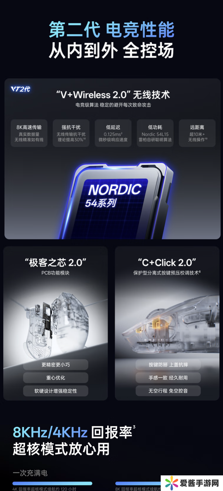 系列鼠标支持有线无线双8KHz回报率,内置 800mAh电池(续航至高 500 小时),搭载 Nordic 54L15主控,其中标准版采用原相3398传感器 + 欧姆龙机械微动,MAX版采用 3950Ultimate传感器 + 雷柏定制光微动。