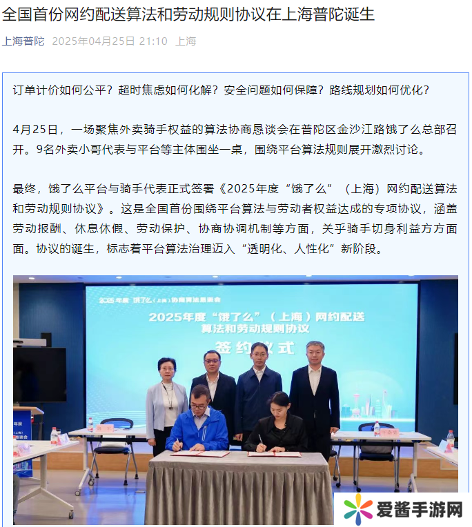 本站 4 月 25 日消息,在今日举行的 2025 年度“饿了么”(上海)协商算法恳谈会上,饿了么宣布与骑手代表正式签订《2025 年度“饿了么”(上海)网约配送算法和劳动规则协议》,这也是全国首份网约配送算法和劳动规则协议。