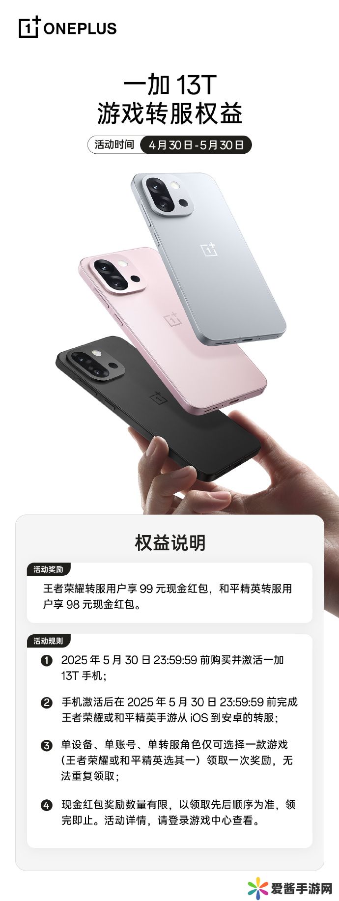 本站 4 月 26 日消息,一加手机今日宣布,4 月 30 日起,购买一加 13T 并激活,从 iOS 到安卓游戏跨服转移,享至高 99 元现金红包,数量有限,先到先得,进入游戏中心 App 搜索“转服”了解更多活动详情。