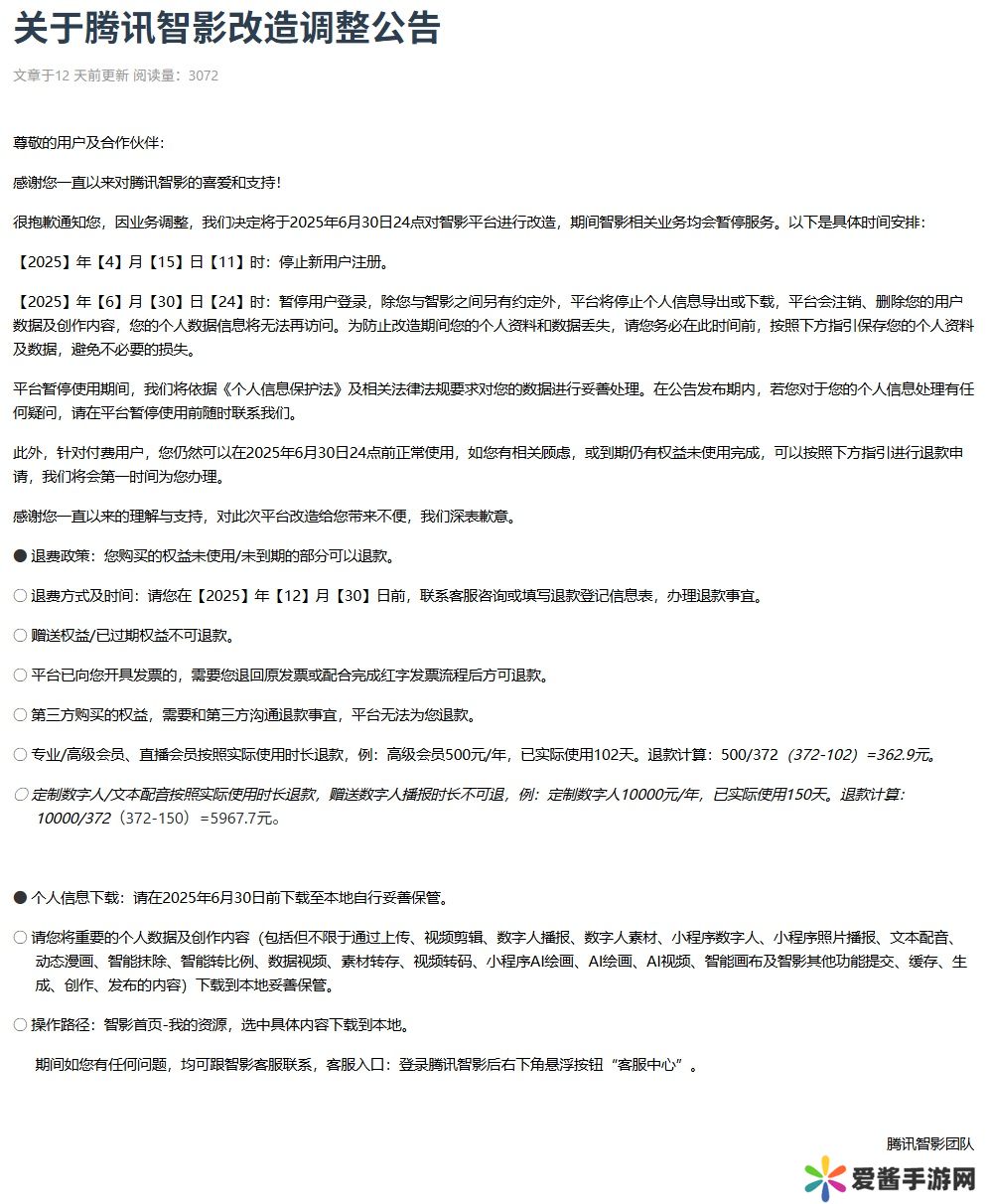 2025 年 6 月 30 日 24 时:暂停用户登录,除用户与智影之间另有约定外,平台将停止个人信息导出或下载,平台会注销、删除用户数据及创作内容,个人数据信息将无法再访问。为防止改造期间用户个人资料和数据丢失,请务必在此时间前,按照下方指引保存个人资料及数据,避免不必要的损失。