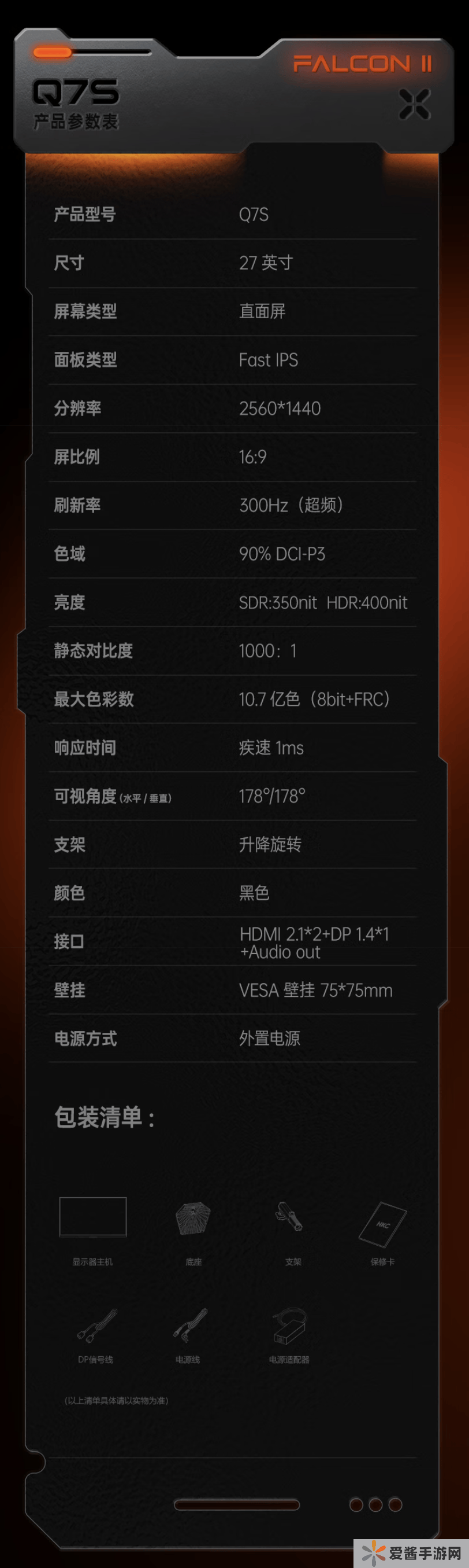Q7S显示器搭载了一块2560x1440分辨率的Fast IPS面板,支持超频至300Hz,为用户带来流畅无阻的视觉体验。其峰值亮度可达400尼特,静态对比度为1000:1,确保了画面的明亮度和对比度表现。该显示器还拥有1ms的GtG响应速度,有效减少了画面拖影现象。