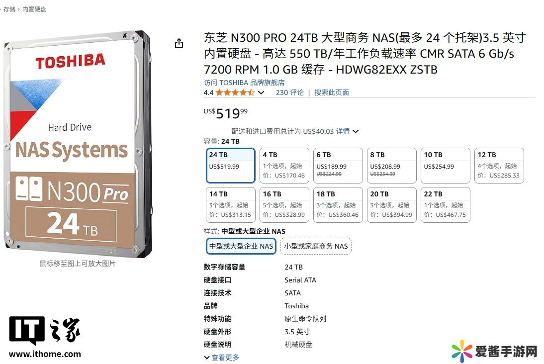 24TB 的 N300 Pro目前已经上架亚马逊并开售,定价显示为 529.99 美元(本站注:现汇率约合 3864 元人民币),而 N300 系列却没有提供对应的 24TB 型号;而且目前仅美国有售,哪怕是日本也没有。
