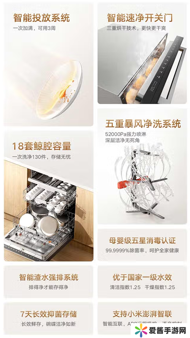 该产品搭载 BLDC 双驱变频电机、智能渣水强排系统,三种洗涤模式可选,上层、下层或全腔随心洗,洗净后开启 7 天长效净味抑菌存储。此外,该产品还支持小米澎湃智联,米家 App、小爱音箱组合控制。