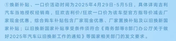官方表示,狂欢吉利价 / 狂欢一口价为该车型官方指导价减去厂家现金优惠,综合购车补贴包含厂家现金优惠、厂家置换补贴及以旧换新国家补贴;以旧换新国家补贴享受条件须符合《商务部等 8 部门办公厅关于做好 2025 年汽车以旧换新工作的通知》等国家相关部门的发文要求。