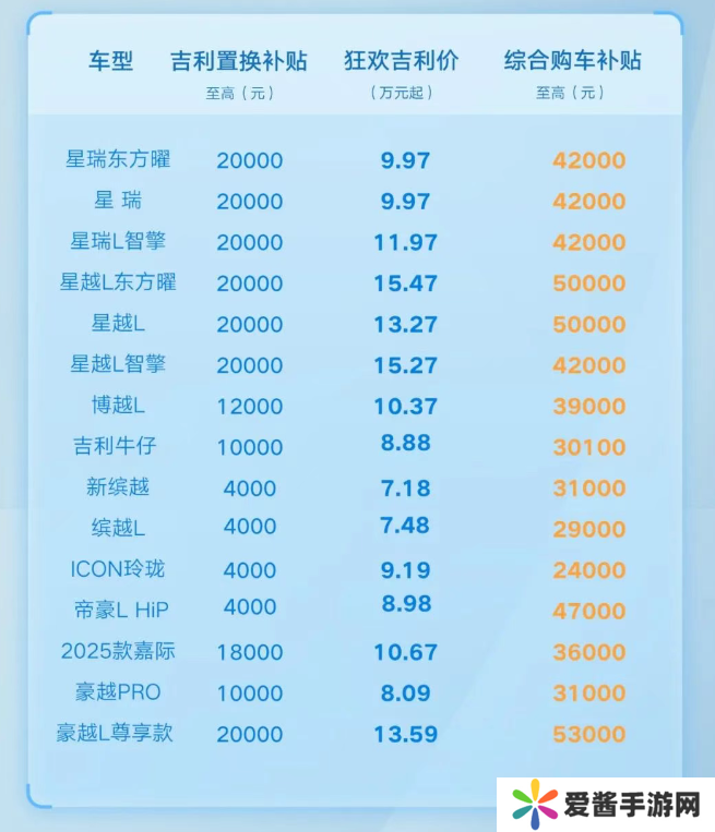 本站 4 月 28 日消息,吉利今日宣布,2025 年 4 月 29 日-5 月 5 日,购买睿蓝 X3 PRO、第 4 代帝豪、缤越超能版、缤瑞 COOL、新博越、豪越 L 可享狂欢一口价。