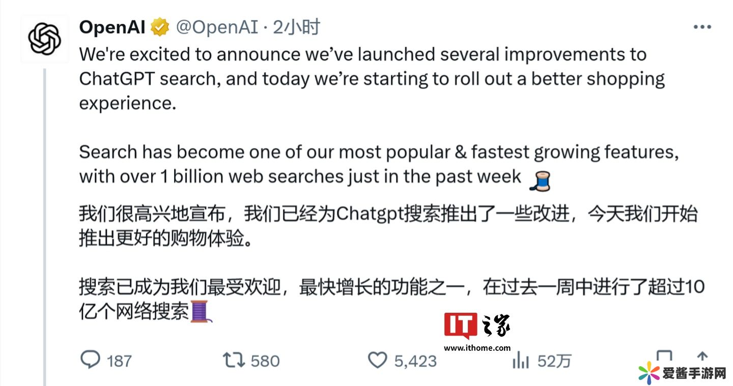 此外,OpenAI 还为 ChatGPT Search 增加了改进引文、趋势话题、自动补全及 WhatsApp 搜索等新功能,进一步提升用户体验。