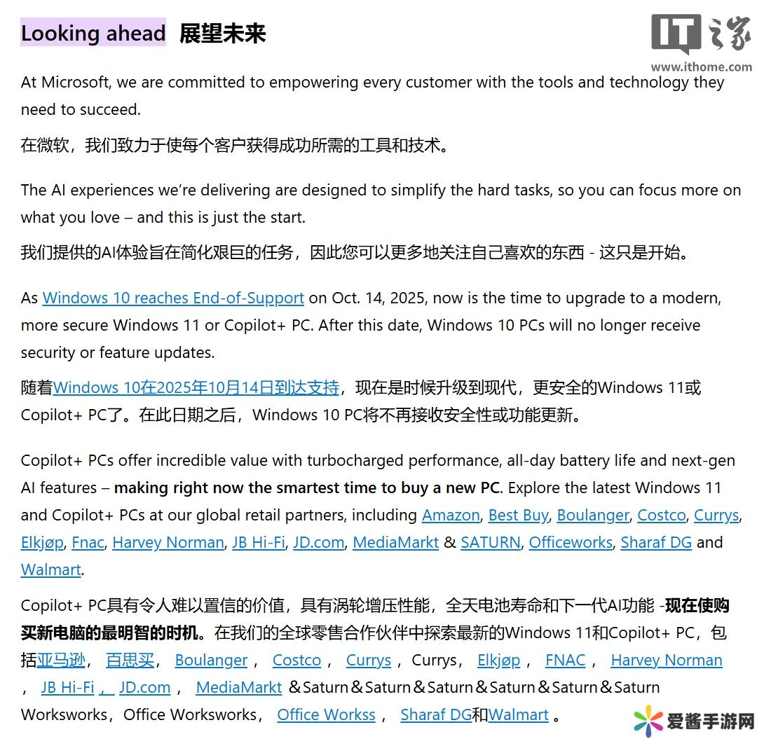 微软在 4 月 25 日发布的博文中,表示 Windows 10 的支持将在 2025 年 10 月 14 日正式结束,公司强烈建议用户抓住时机,升级到更安全、更现代的 Windows 11 系统。
