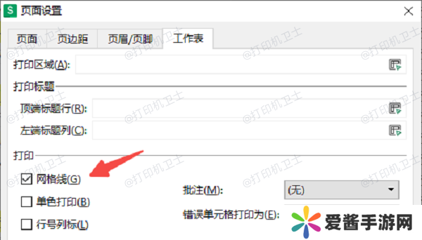 在弹出的“页面设置”窗口中,切换到“工作表”标签页,勾选“网格线”选项。