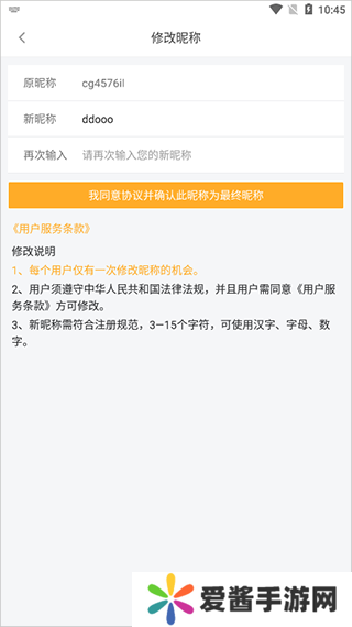 5、进入修改昵称界面后,输入新的昵称,点击同意协议,完成昵称修改;