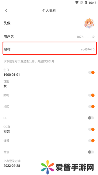 4、进入个人资料界面后,点击页面中的昵称菜单;