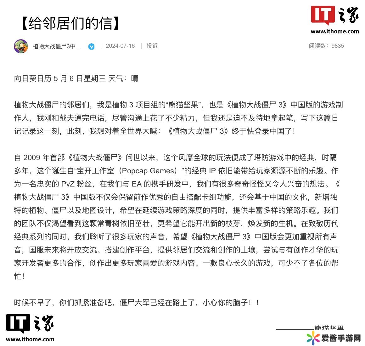 去年 7 月,《植物大战僵尸 3》官博发布了“给邻居们的信”,信中《植物大战僵尸 3》中国版的游戏制作人熊猫坚果透露,《植物大战僵尸 3》中国版不仅会保留前作自由搭配卡组功能,还会基于中国文化新增独特的植物、僵尸以及地图设计。