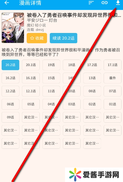 6、在漫画的主要详情介绍页面,能够看到右上方的下载项图标,这里我们选择它。