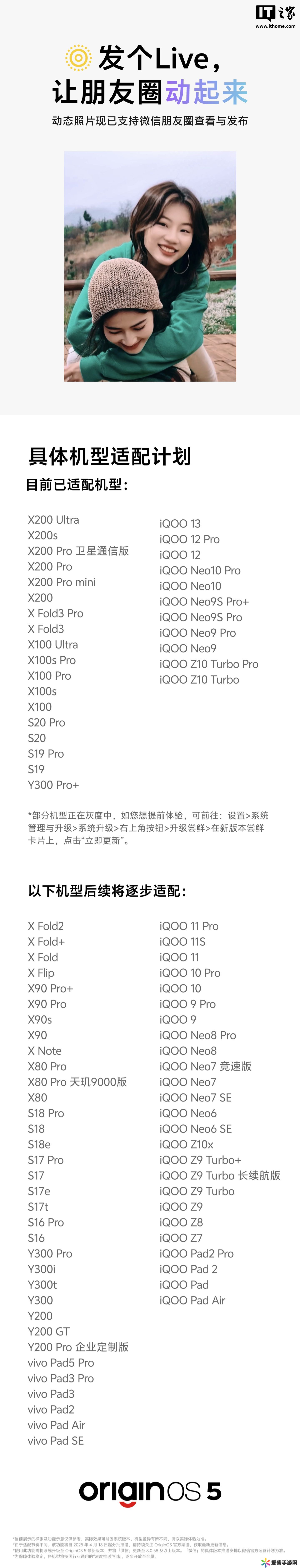 本站 5 月 6 日消息,vivo 手机操作系统官方微博@OriginOS原系统 今日公布了微信朋友圈 Live 图适配机型,含 vivo X200 系列、iQOO 13/12 等机型。
