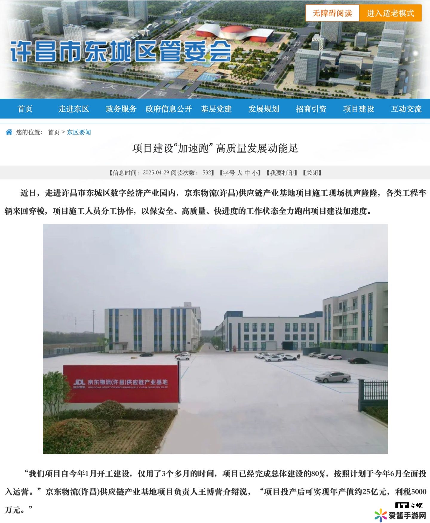 本站 5 月 6 日消息,据河南省许昌市东城区管委会官网消息,胖东来商贸集团联合京东物流集团打造的首个河南供应链产业基地“京东物流 (许昌) 供应链产业基地项目”将于今年 6 月(下月)全面投入运营。项目负责人介绍称,该项目投产后可实现年产值约 25 亿元,利税 5000 万元。