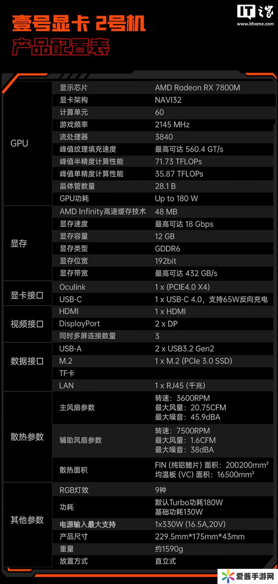 在性能表现上,壹号显卡二号机配备了 AMD Radeon RX 7800M 独立显卡以及 PCIe 3.0 SSD 插槽,支持多屏输出。