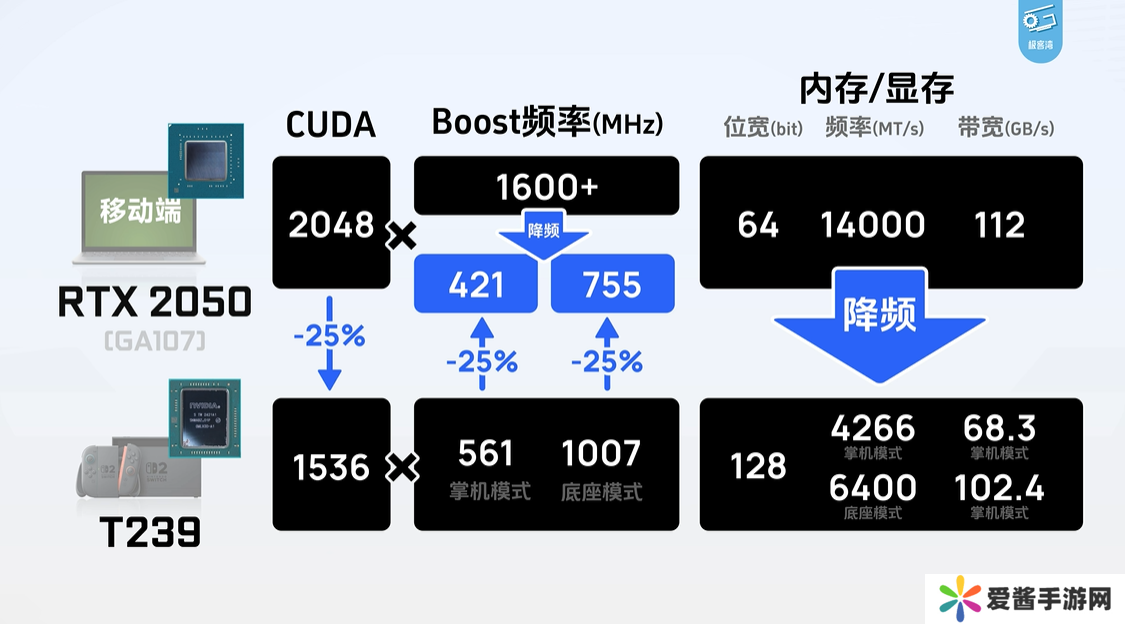 极客湾绘制了该芯片的晶圆图,显示出八颗 A78C CPU 核心紧挨着一个巨大的基于 Ampere架构的 GPU,这个 GPU 与 Nvidia RTX 30 系列显卡采用相同的架构,晶圆图显示其拥有 12 个 SM 单元,总计 1536 个 CUDA 核心。作为对比,这相当于桌面版 RTX 3050 显卡核心数量的一半多一点。极客湾认为,与 Switch 2 的 SoC 最接近的比较对象是降频版的 RTX 2050 笔记本显卡。