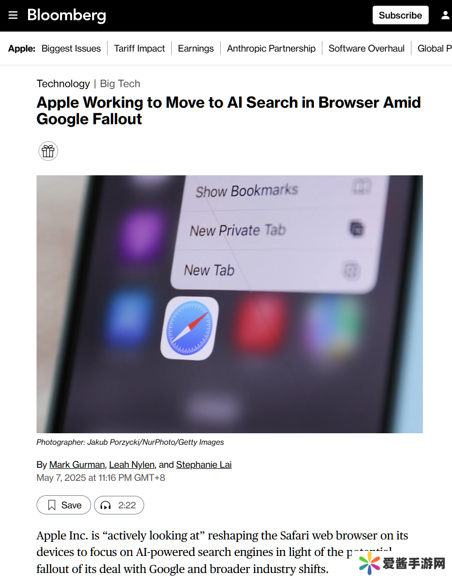 本站 5 月 7 日消息,据彭博社报道,苹果公司正积极考虑重塑其 Safari 浏览器,将重点转向由 AI 驱动的搜索引擎。