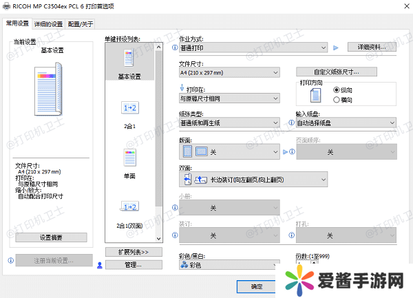 2、设置默认纸张大小在“打印首选项”窗口,切换到“设备设置”或“高级”选项卡。