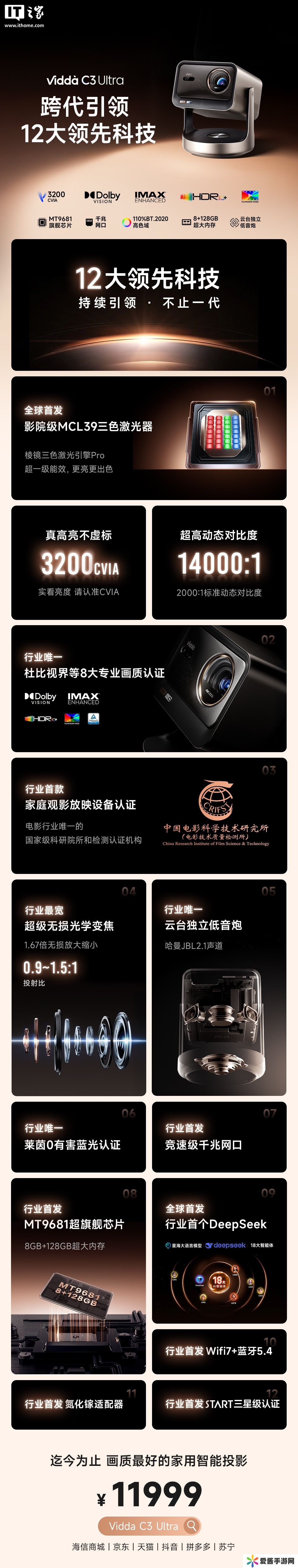 Vidda C3 Ultra 首发价 11999 元,首发影院级 MCL 39 三色激光器、支持 0.9~1.5:1 投射比,升级到 3200 CVIA 流明亮度,搭载“行业唯一”云**立低音炮(哈曼 JBL 2.1 声道),8GB + 128GB 存储。