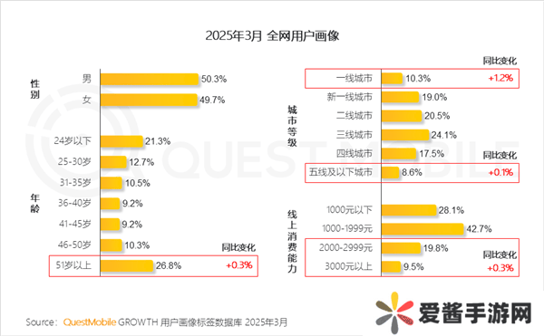 在用户的年龄构成上,中老年群体展现出了强劲的增长势头。51岁及以上的用户占比已达到26.8%,显示出互联网正日益成为这一年龄段人群生活中不可或缺的一部分。与此同时,其他年龄段的用户分布也各具特点:24岁以下的年轻用户占比为21.3%,依旧保持着较高的活跃度;25至30岁的用户群体占比12.7%,紧随其后;31至35岁的用户占比为10.5%,而36至40岁和41至45岁的用户则各占9.2%;46至50岁的用户比例则为10.3%。