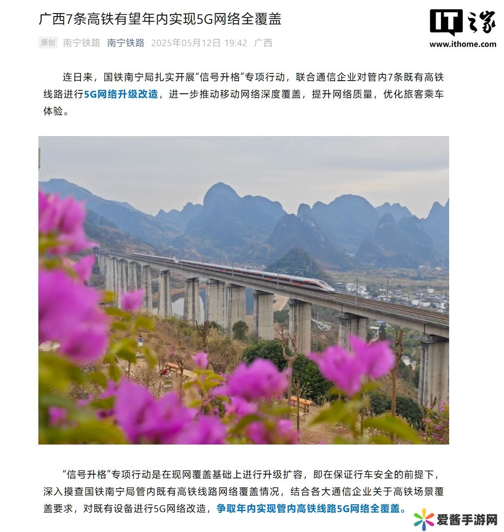本站 5 月 12 日消息,本站从“南宁铁路”公众号获悉,国铁南宁局扎实开展“信号升格”专项行动,联合通信企业对管内 7 条既有高铁线路进行 5G 网络升级改造,进一步推动移动网络深度覆盖,提升网络质量,优化旅客乘车体验。