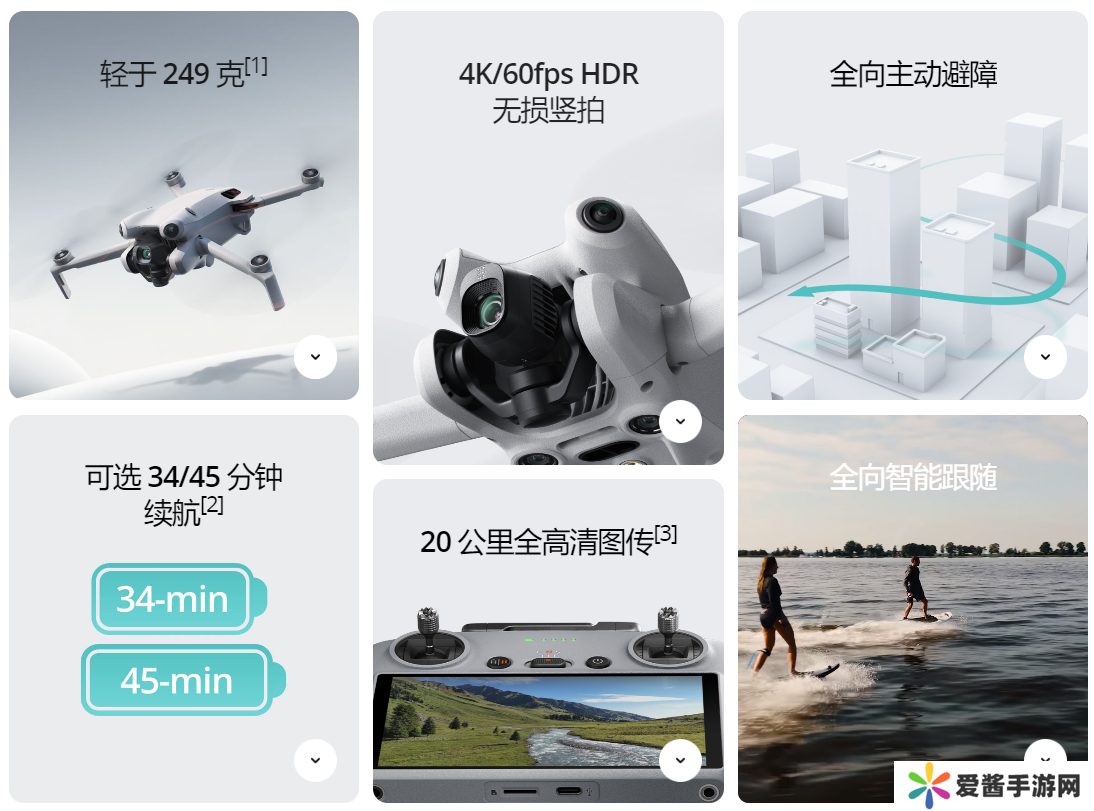官方称,DJI Mini 4 Pro 集全面的影像实力、全向主动避障、全向智能跟随、20 公里全高清图传等性能于一身,打造 DJI Mini 系列迄今为止最全能的航拍机。