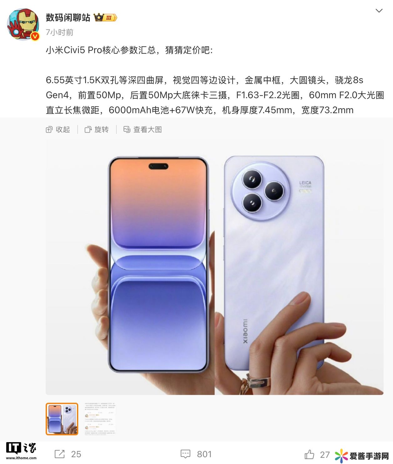 本站 5 月 17 日消息,博主@数码闲聊站 发文,公布了小米 Civi 5 Pro 核心参数,并披露了该机的外观照片。
