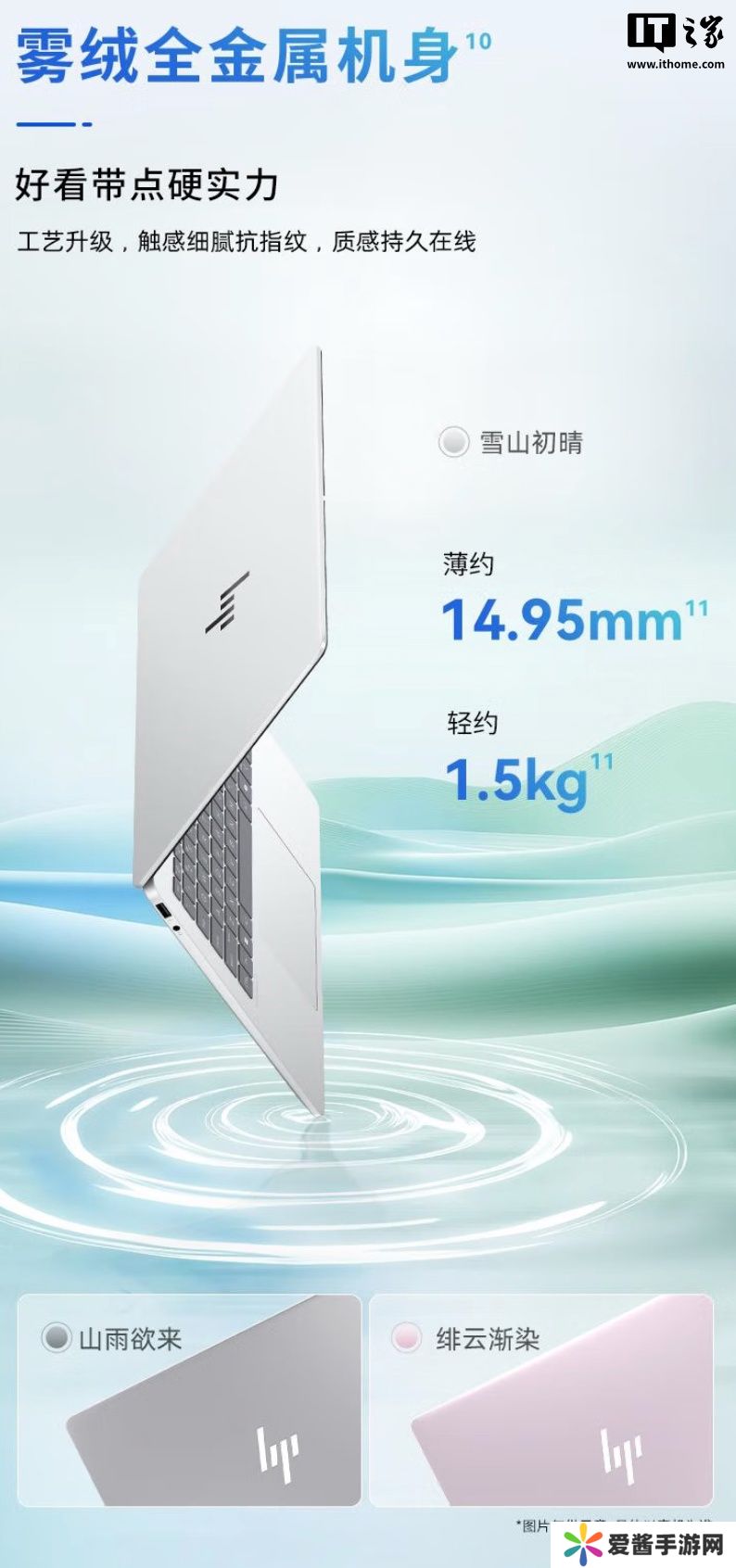 该机拥有粉 / 灰 / 银三种配色可选(但目前仅上架银色),机身薄至 14.95mm,轻约 1.5kg,内置惠小微 5.1AI 助理,通过 MIL-STD-810H 标准认证,内置68 Whr电池。