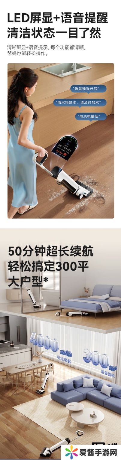 该洗地机提供21000Pa吸力,拥有0缠毛技术,支持180度躺平洗地,可自行切换三种档位洗地模式。洗地机顶部配备LED屏显示,可通过语音指导用户操作,洗地机内置4000毫安时电池,覆盖300平方米户型。