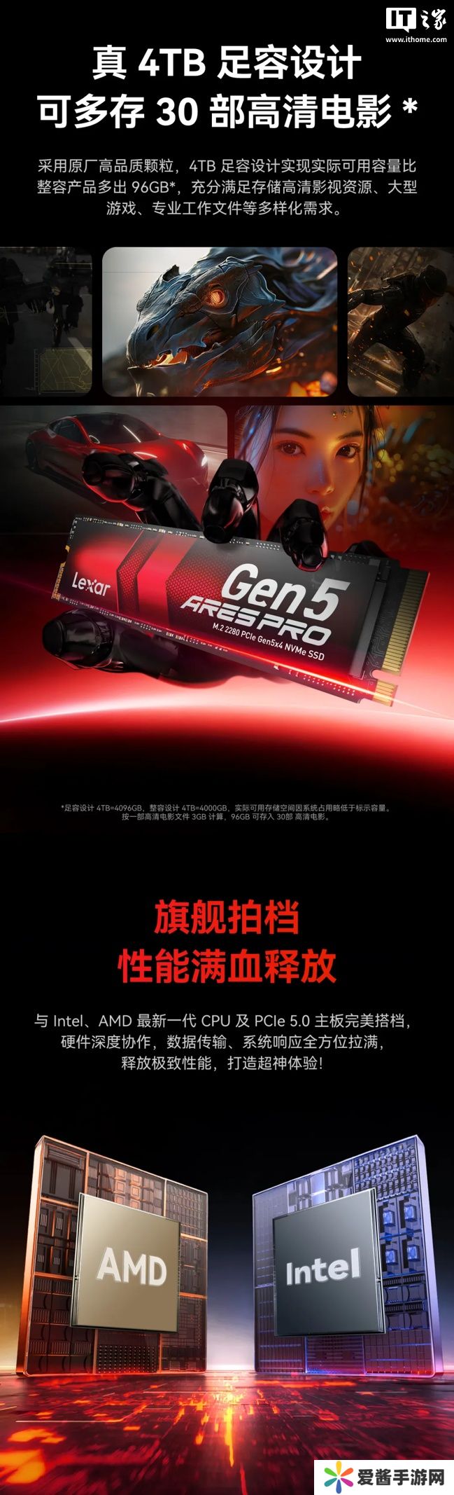 产品还支持微软 DirectStorage 技术,采用 4TB 足容和单面 PCB 设计,配有 Lexar DiskMaster 固态硬盘管理助手,并提供 5 年质保。