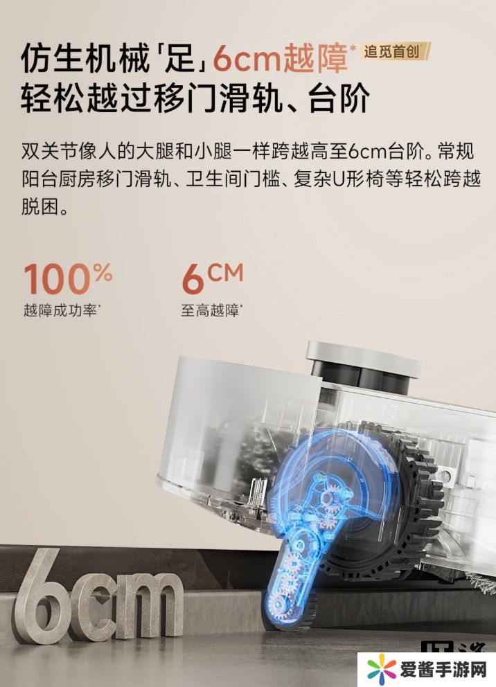 该机器人配备仿生机械足,号称可以像人的大腿和小腿一样跨越高6cm台阶,可以跨越阳台厨房移门滑轨、卫生间门槛、U 形椅等场景。