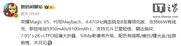 本站 6 月 5 日消息,博主@数码闲聊站 昨日曝光荣耀 Magic V5 折叠屏手机的主要规格,并称“本月见”。