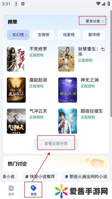 必访小说软件看小说教程1、下载并安装必访后打开软件,进入【发现】专区,在这个你可以通过榜单推荐来找到自己喜欢的作品,点击“查看全部分类”或“更多分类”。