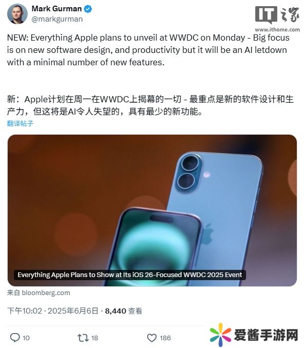 本站 6 月 6 日消息,彭博社马克古尔曼刚刚发文称,苹果公司即将召开的全球开发者大会(WWDC)未能缓解外界对其在 AI 领域落后的担忧。