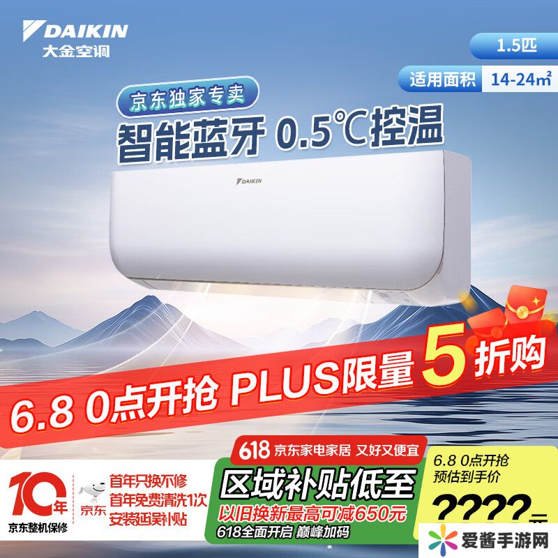 京东大金空调 大 1.5 匹 新二级 小鑫 变频冷暖 家用 空调挂机 0 点限量 5 折购 6199 元直达链接