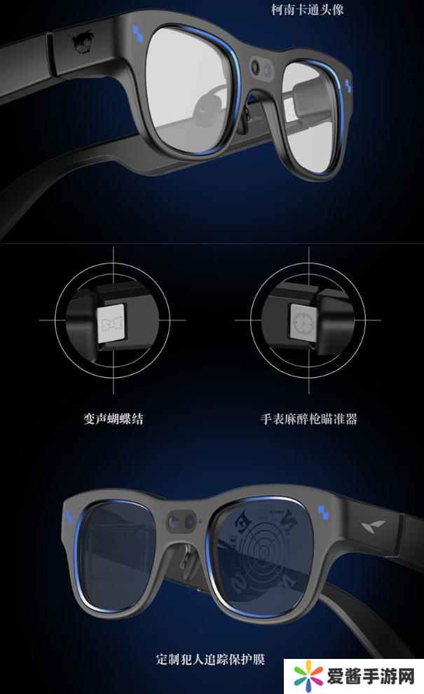 据介绍,这款眼镜以江户川柯南标志性头像与眼镜为设计灵感,镜腿、转轴处细节精心设计经典元素,包括柯南定制眼镜盒、变声蝴蝶结、手表麻醉枪瞄准器、定制犯人追踪保护膜、柯南定制眼镜盒等。