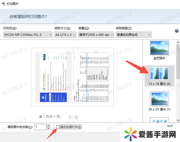 在“页面布局”部分,选择“13×18厘米(2)”,这样两张图片就会自动排布在一张纸上。