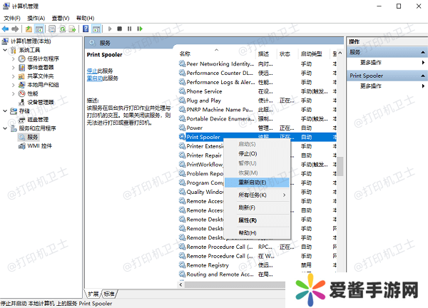 2、在服务列表中,找到 Print Spooler,右键选择“重新启动”。
