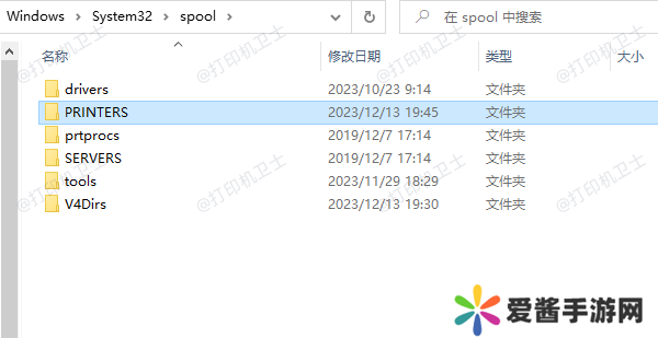 2、打开 C:WindowsSystem32spoolPRINTERS 目录(需要管理员权限),删除该文件夹下的所有文件。