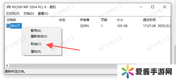 3、在打印队列窗口中,右键点击待删除的任务,选择“取消”。