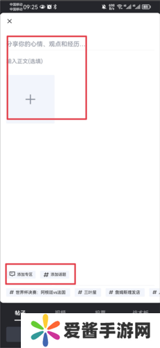 2、进入后输入你要发布的内容并点击发布即可,点击添加专区或话题可以让帖子发布在喜欢的专区下。
