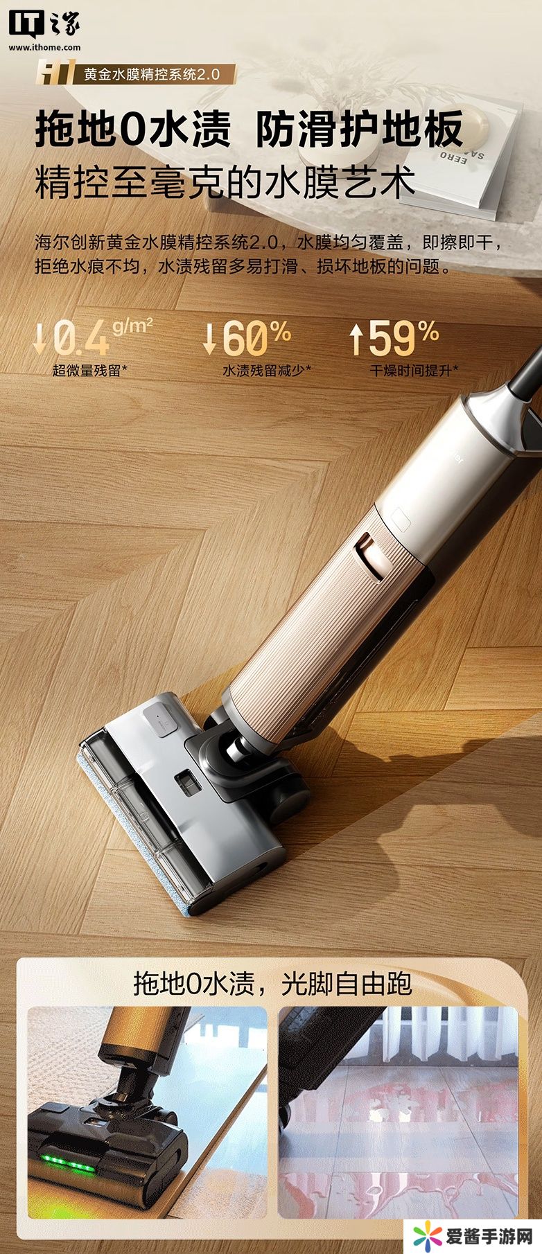 此外,该洗地机提供黄金水膜精控系统 2.0,可将将清水均匀喷洒在滚刷上,在拖地过程中实时刮除地面多余水分,关机时自动回退 3 秒回收残水;同时配备 75℃热水洗拖布,高温溶解油污并杀灭 99.9% 细菌;烘干阶段提供 5 分钟速烘(85℃高温)和 20 分钟柔烘(60℃低噪)双模式,满足不同场景需求。