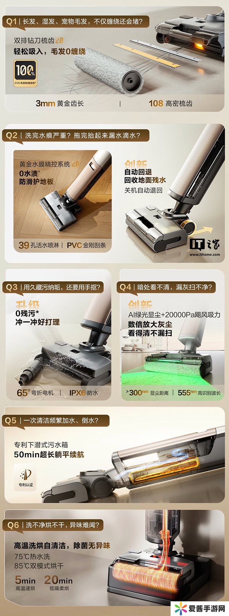 据介绍,这款洗地机提供 20000Pa 吸力,同时带有双排钻刀梳齿 2.0 系统,可实现 50cm 长发一次性吸入,吸入即粉碎,全程 0 缠绕。
