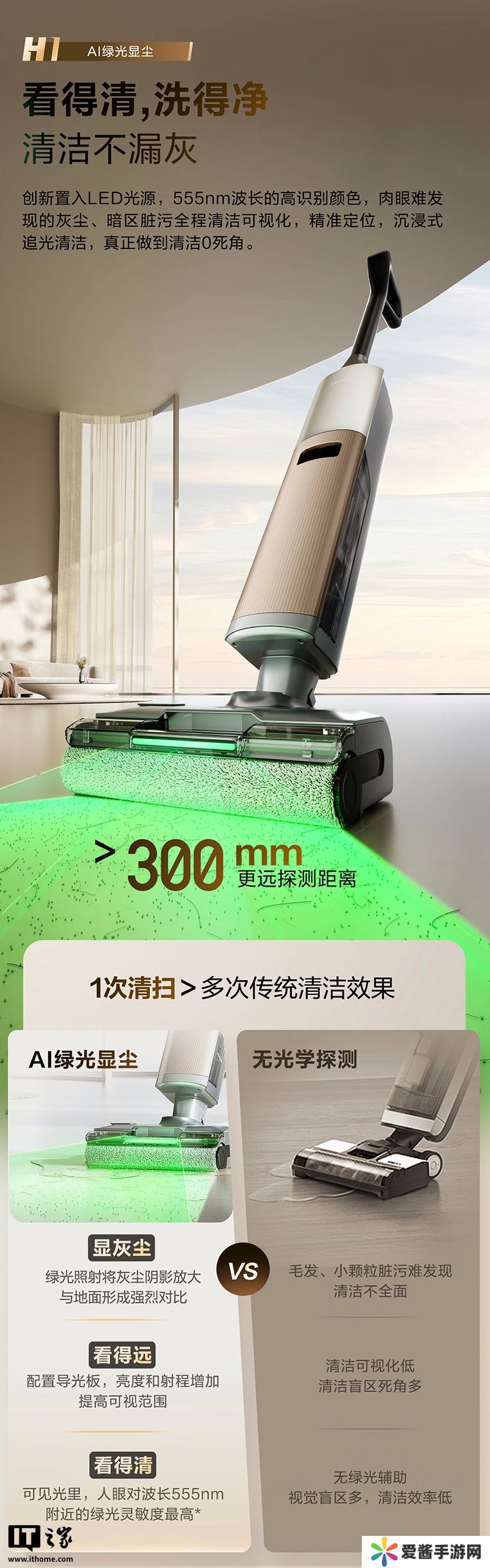 其他方面,该洗地机提供 65° 弯折可水洗电机,拥有 IPX6 防水设计;匹配绿光显尘技术,拥有 >300nm 显尘距离;洗地机内置 800ml 容量水箱,提供 5000mAh 电池,拥有 50 分钟续航。