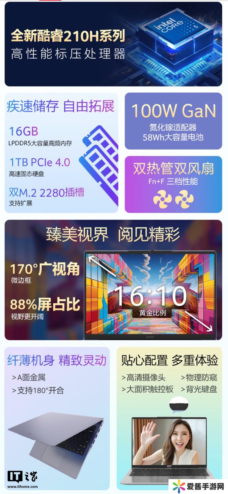 该机搭载 8 核心 12 线程英特尔酷睿 5-210H 处理器,内置 16GB 4800MHz RAM 和 1TB PCIe 4.0 SSD,使用双风扇双热管散热。