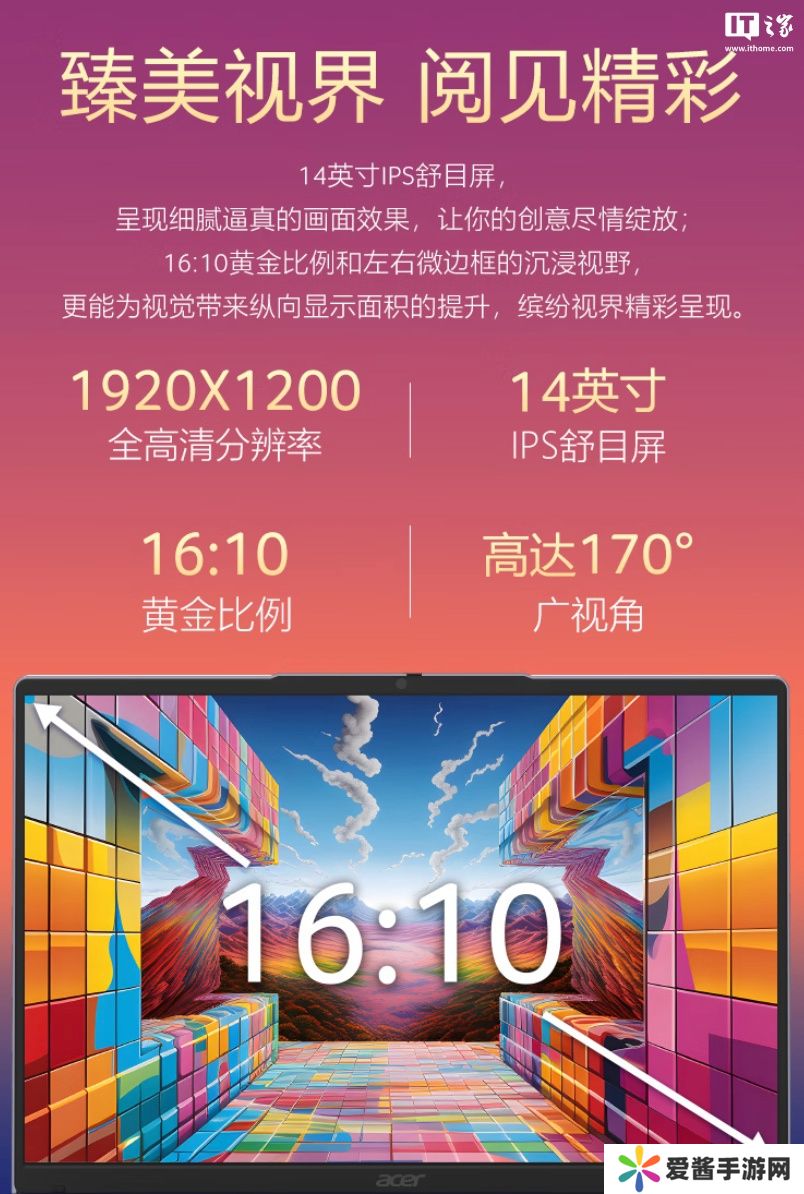 该机整体重量 1.49 千克,厚度 17.9 毫米,A 面采用金属材质,笔记本支持 180 度开合,B 面匹配一块 14 英寸 1920x1200 分辨率 60Hz 面板,匹配 58Wh 电池,标配 100W 氮化镓适配器。