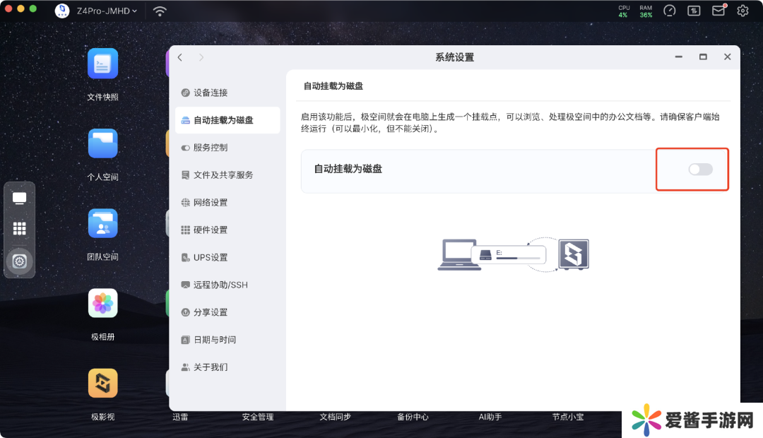 Mac 党不用每次手动挂载磁盘了,将客户端升级到 V2.26 后,把系统设置里的“自动挂载为磁盘”打开后,以后打开电脑,极空间里的磁盘就会自动就位,传输文件、查看资料不用再额外操作,就像使用本地磁盘一样。