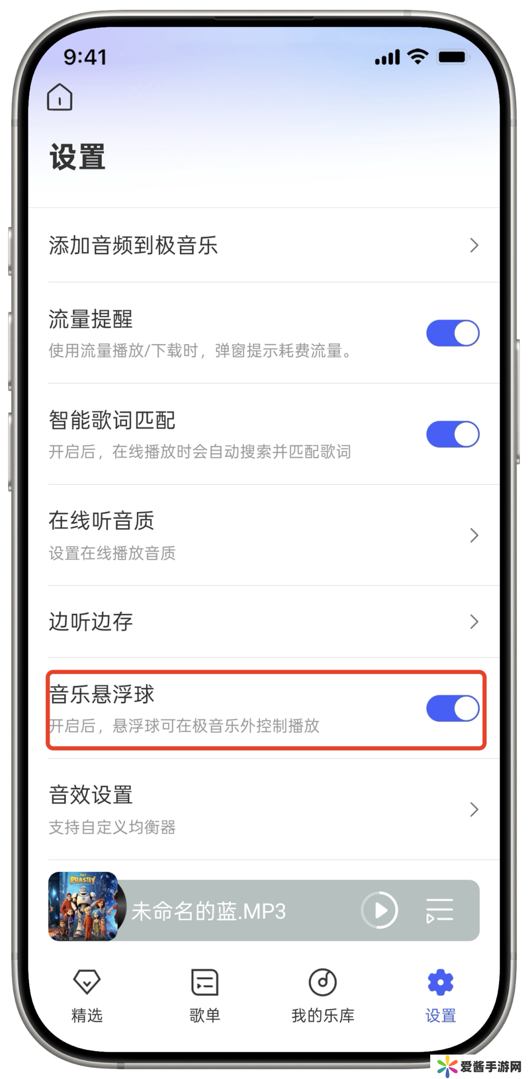 打开极音乐设置里的“音乐悬浮球”功能后,悬浮球会待在屏幕角落,切换页面、退回桌面都不影响听歌。