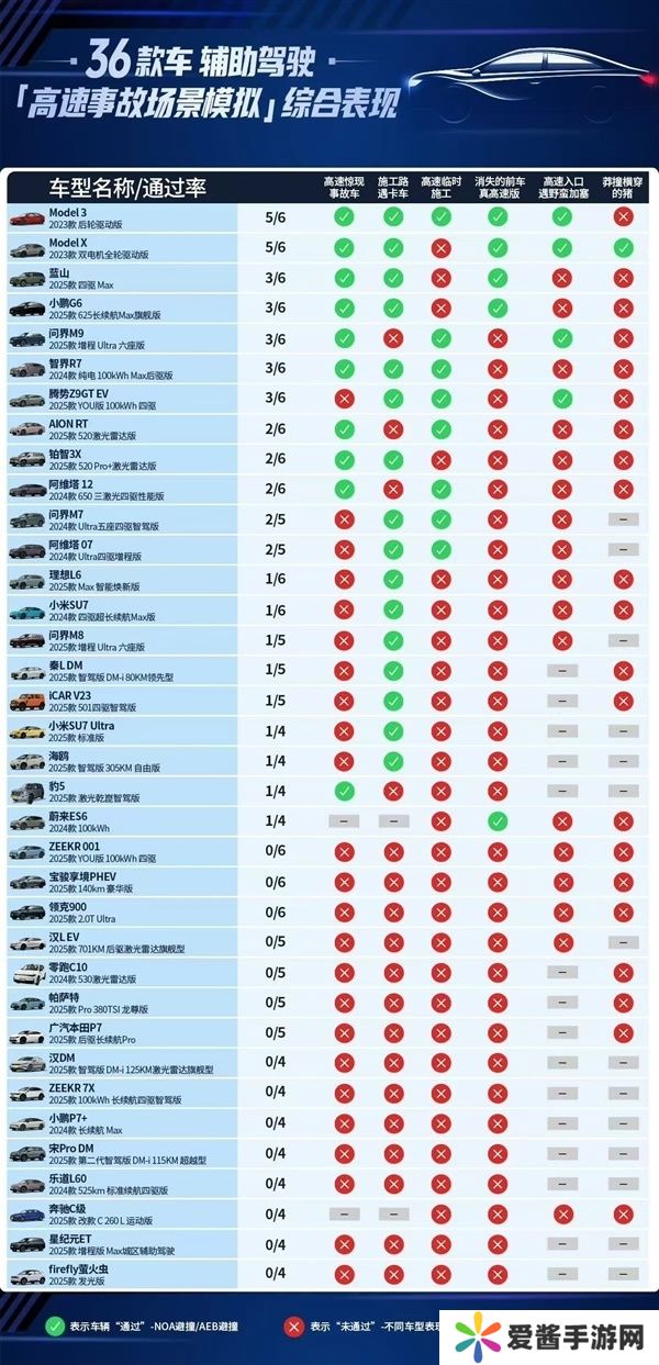 在懂车帝进行的 36 款车辅助驾驶高速事故场景模拟测试中,阿维塔 12 通过了“高速惊现事故车”、“高速临时施工”两个场景,其余 4 个场景测试未通过。